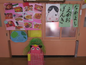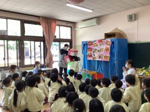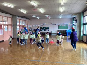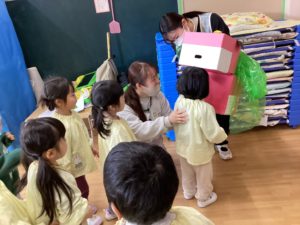6日の地震で延期になっていた行事のお話「お正月ってなあに?」の集会で沢山の小道具と共に、日本・世界の