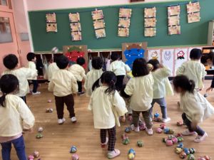 2階のホールでは以上児さんが新聞ボールで豆まきして鬼に命中!「赤鬼さんをやっつけたぞ☆」